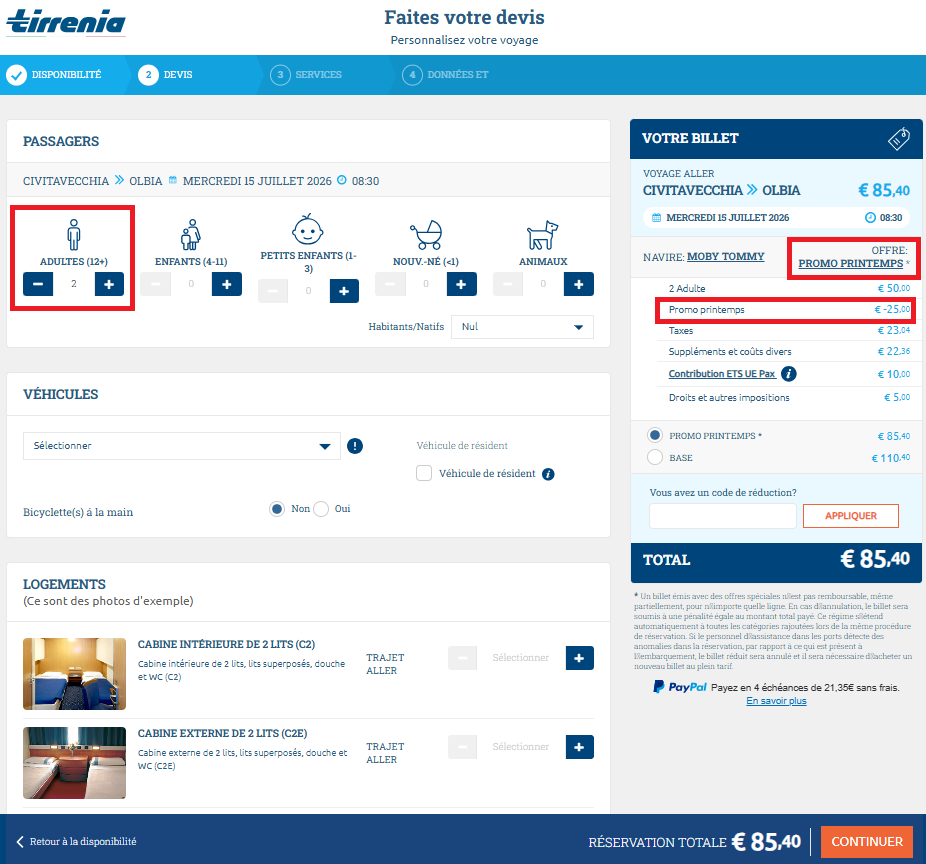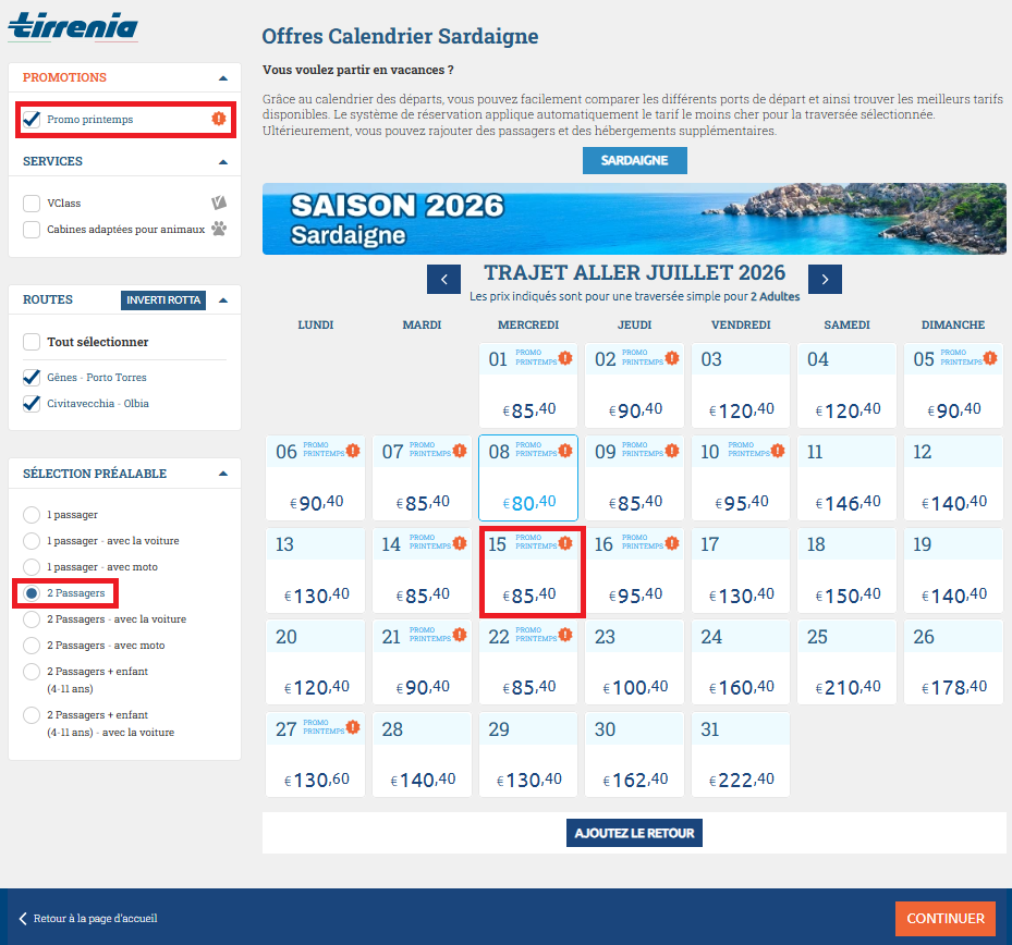 • Les réservations doivent être effectuées du 16/03/2026 au 19/03/2026 pour les départs Tirrenia, Gênes-Porto Torres-Gênes et Civitavecchia-Olbia-Civitavecchia du 01/06/2026 au 30/09/2026 ;